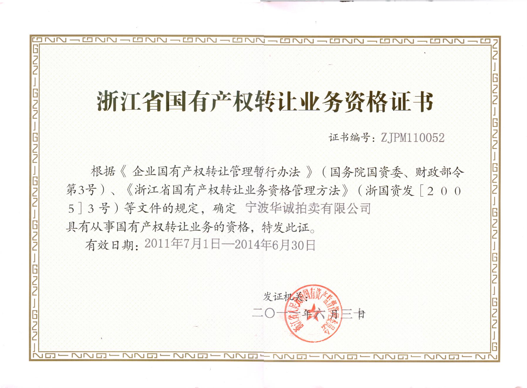 2011年7月,我公司获得浙江省国有产权转让业务资格证书。