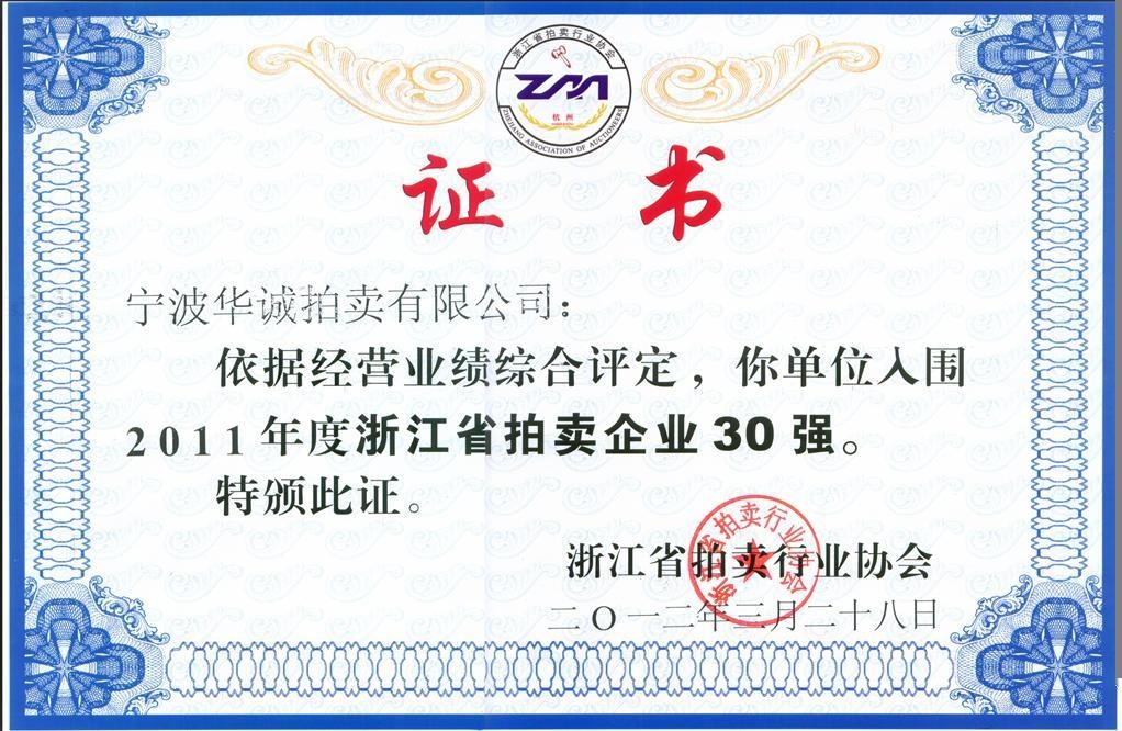 2012年2月,被浙江省拍卖行业协会评定为“2011年度浙江省拍卖企业30强”。